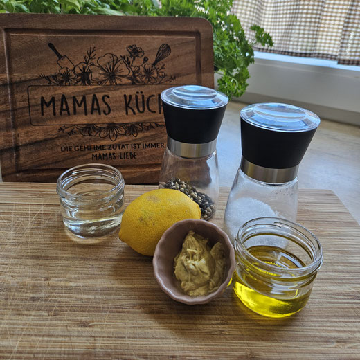Die Zitrone wird ausgequetscht und mit den restlichen Zutaten zusammen gerührt. Mit Salz und Pfeffer musst du das nach deinem Geschmack anpassen.